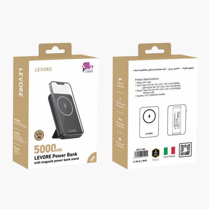 ليفوري - شاحن متنقل مغناطيسي ماج سيف بسعة 5000 ملي امبير للآيفون وبمنفذ بي دي 20 واط - أسود