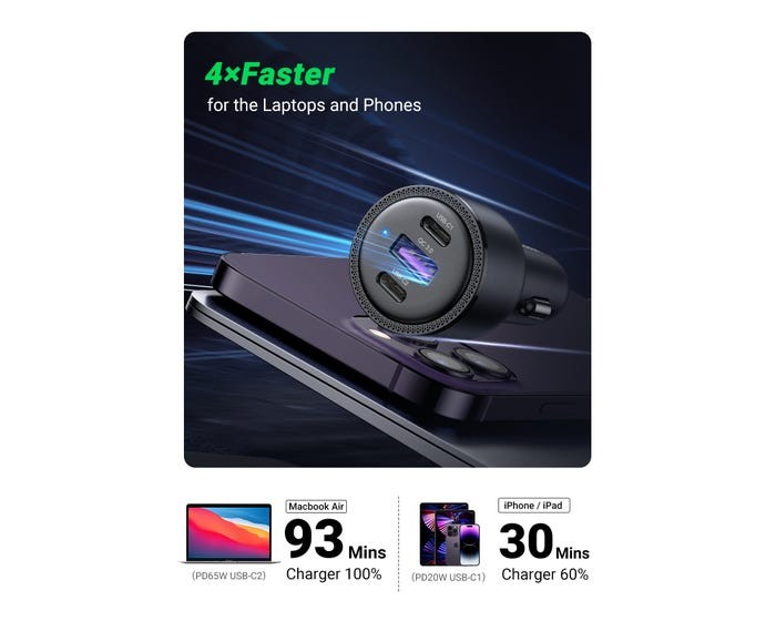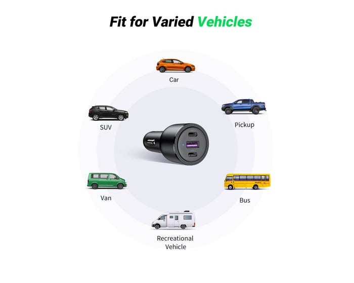 شاحن سيارة ذكي مع 3 منافذ USB (بما في ذلك منفذا USB من النوع C)