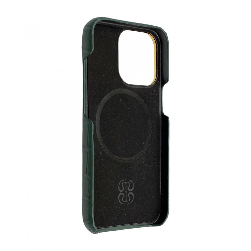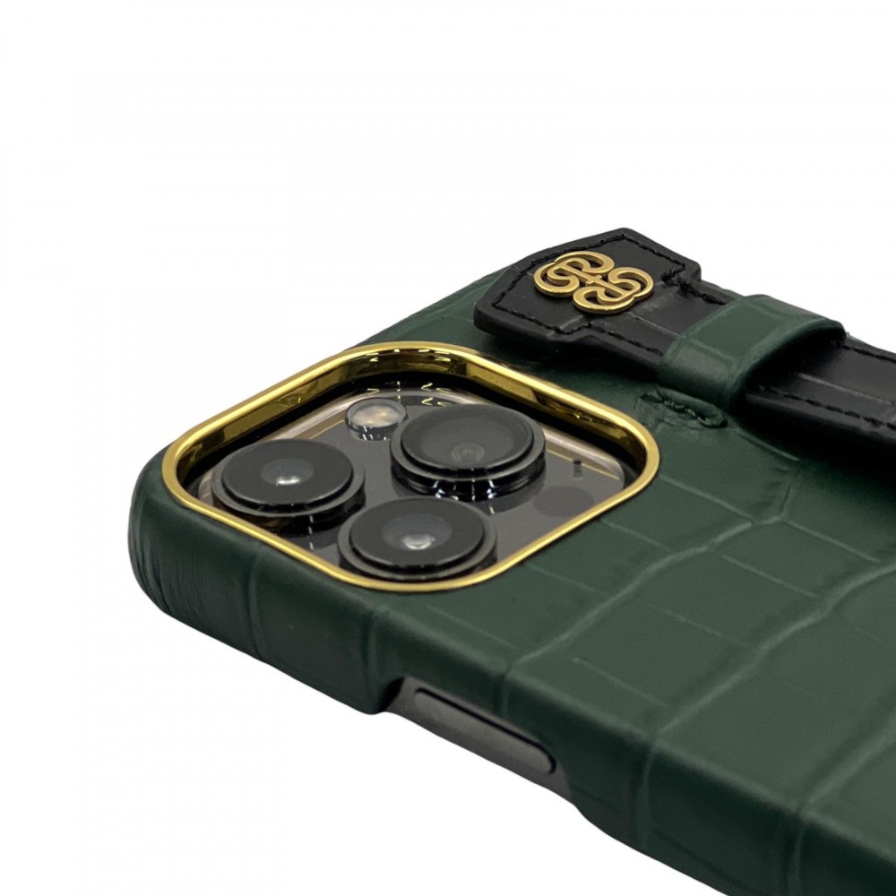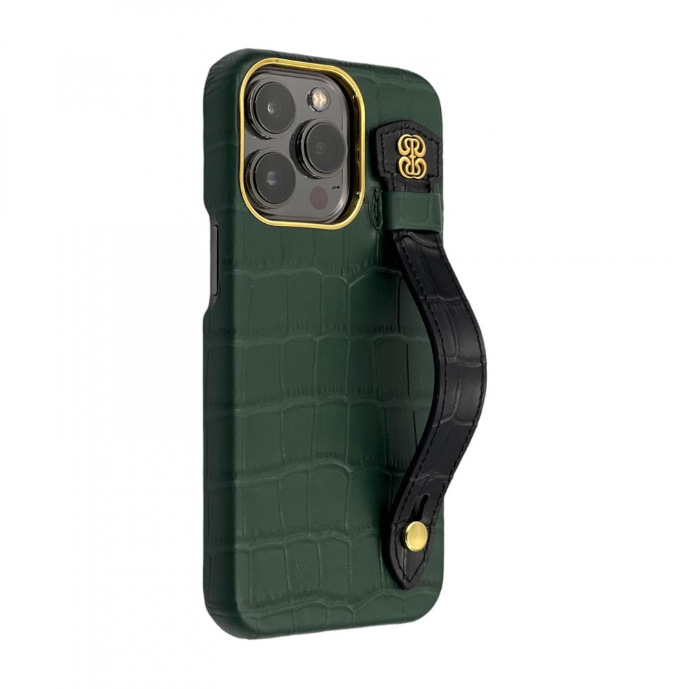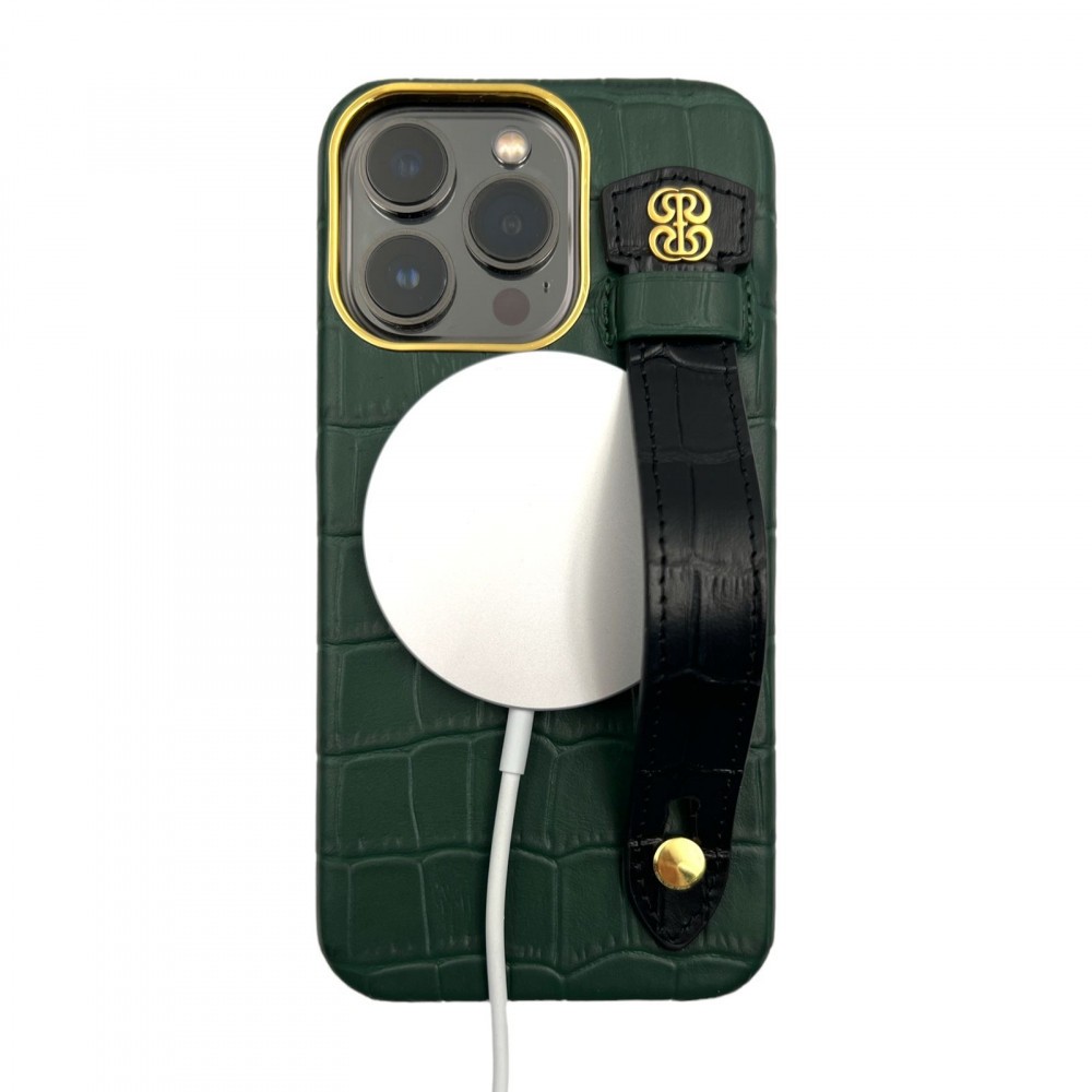 كفر ايفون 13برو مصنوع من الجلد مع مسكة لون زيتي مع ماج سيف