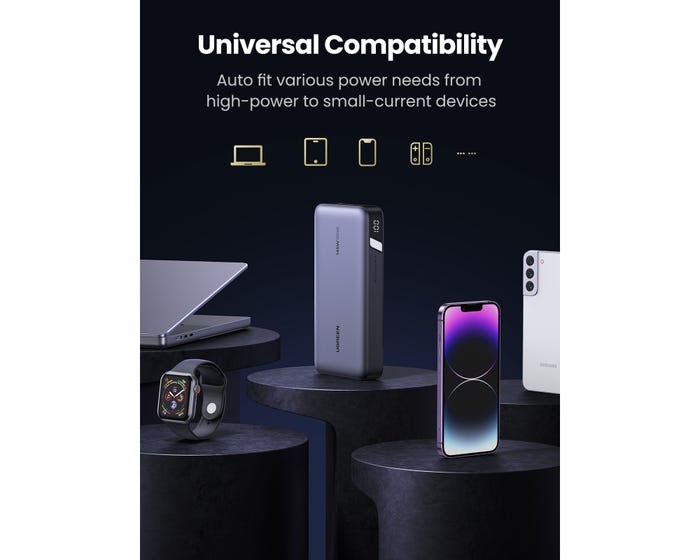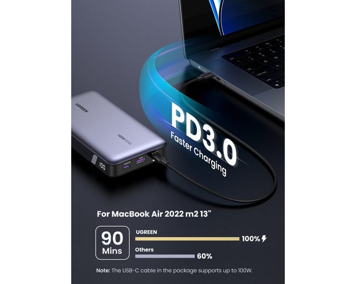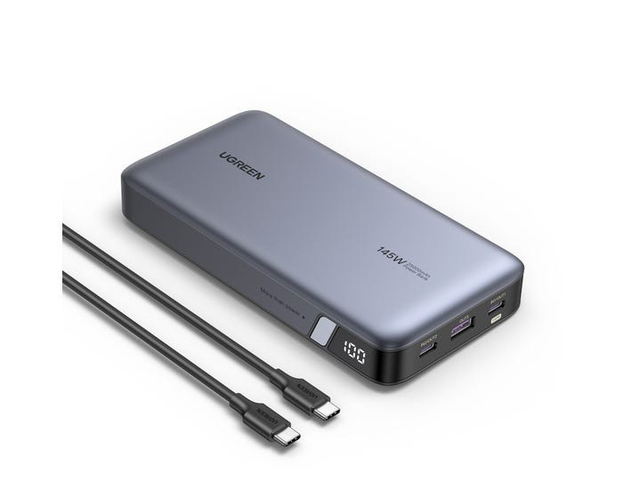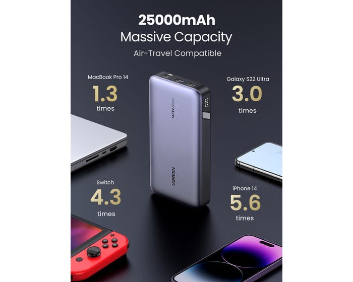 سعة هائلة تبلغ 25000 مللي أمبير في الساعة: يأتي بنك الطاقة المحمول للشحن من Ugreen مزودًا ببطارية ضخمة تبلغ 25000 مللي أمبير في الساعة ويبلغ إجمالي خرج الطاقة 145 وات! أعد شحن أجهزة الكمبيوتر المحمولة بالكامل حتى 1.3 مرة وشحن الأجهزة المحمولة حتى 5.6 مرة.