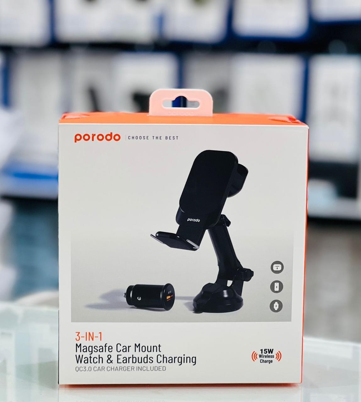 حامل جوال للسيارة شحن لاسلكي 3 في 1 مع شاحن شيارة Porodo MagSafe Car Mount and Watch & Earbuds Charging with Car Charger ، يتميز بالتصميم الأنيق والجودة العالية، يمكنك من تثبيت هاتفك المحمول وشحنه في السيارة بسهولة ، بالاضافة الى امكانية شحن سماعة اذن ايربودز والساعات الذكية لاسلكيا.